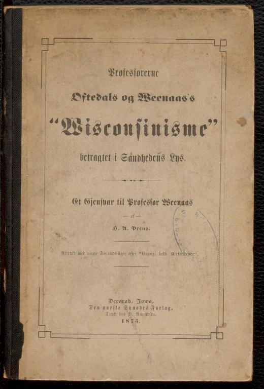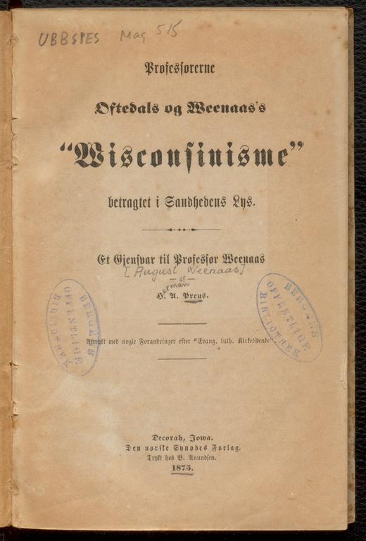 Professorerne Oftedals og Weenaas's "Wisconsinisme" betragtet i Sandhedens Lys : et Gjensvar til Professor Weenaas - data