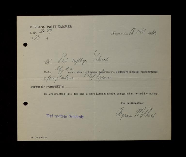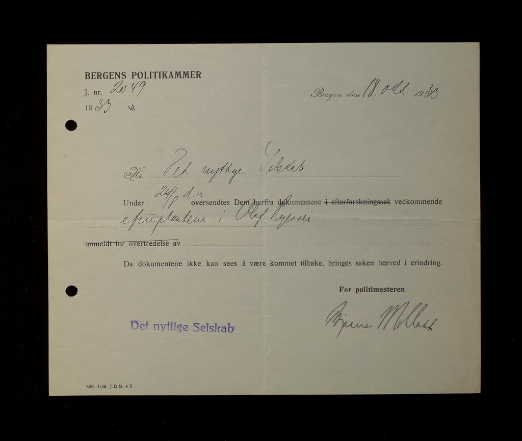 Relatert til: Det Nyttige Selskab, Det Nyttige Selskab, Innkomne brev m.m., 1933