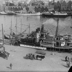 Hest, Horse, Bil, Car, Oversiktsbilde, Kaianlegg, Wharf, Advertising sign, Reklameskilt, Tram rails, Trikkeskinner, Fjordabåt, Kiosk