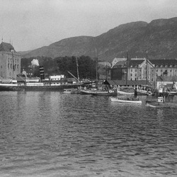Fjordabåten nærmest kaien er "Manger". Det hvite skipet langs Bryggen er "Galtesund".