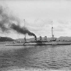 Det franske krigsskipet "Strasbourg" i byfjorden. Bygget i Tyskland som "SMS Regensburg", og tilhørte Graudenz-klassen. Ble etter første verdenskrig overtatt av franskmennene. Gikk under navnet ...