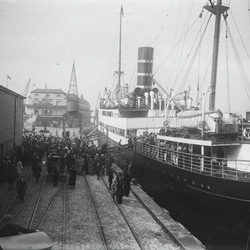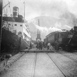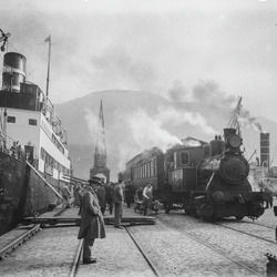 Skip, Ship, Passenger, Passasjer, Tog, Train, Kaianlegg, Wharf, Damplokomotiv, Steam locomotive, Barrel, Tønne, Jernbanevogn, Railway carriage