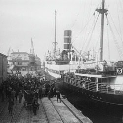 Skip, Ship, Passenger, Passasjer, Hest, Horse, Tog, Train, Horse drawn carriage, Hestekjerre, Kaianlegg, Wharf, Damplokomotiv, Steam locomotive, Barrel, Tønne, Jernbanevogn, Railway carriage