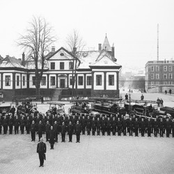 Parti fra brannstasjonen. 2 stigebiler med sjåfører og brannmenn med hest og vogn ca. 1925