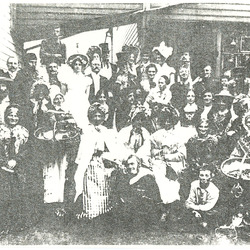 Eldre forestillingsfoto fra amatørforestilling. St. Hansforestilling i Det Gamle Teater 1902. På bildet:1. Einar Juell 2. Fru Schetelig f.Grieg3. Ingolf Gundersen 4. Fru Holm f. Gundersen5. Nicolay ...
