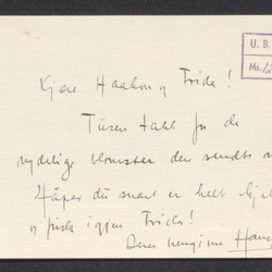 Håndskrevet kort til Haakon og Frida Shetelig der Hans Jacob Nilsen takker for nydelige blomster.