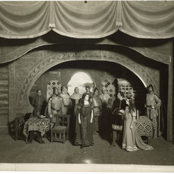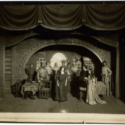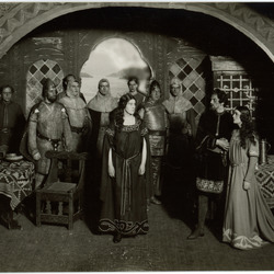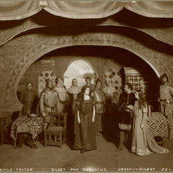 Eldre forestillingsfoto fra produksjonen av "Gildet paa Solhaug" av Henrik Ibsen. Produksjonen hadde premiere 22. mars 1928 i anledning hundreårsjubileet for Henrik Ibsens fødsel. Produksjonen ble spilt ...