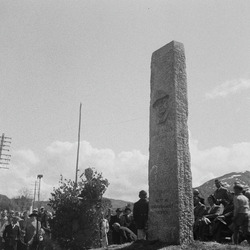 Fra avduking av Turnold-steinen i Selje. (Bernt Tunold 1877-1946). Monumentet var lagd av Sofus Madsen. Trolig fotografert av Liv Kooter-Lauhn.