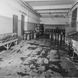 Interiør, trolig fra meieri. Stort rom med steingulv og mange melkespann