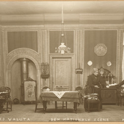 Eldre forestillingsfoto fra 1 akt av produksjonen av "Capriciosa" av Anton Ludvig Arnesen og Thomas Overskou ved Den Nationale Scene. Produksjonen hadde premiere 21. desember 1919.Tekst på ...