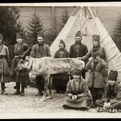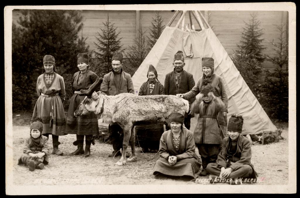 Dette bildet er knyttet til emnene Barn og andre voksne, Familiegruppe, Gakti, Gruppe, Kommager, Lavvo, Postkort, Reinsdyr, Samisk, Samisk barn, Samisk lue, Samiske klær, Turisme, Utstilling