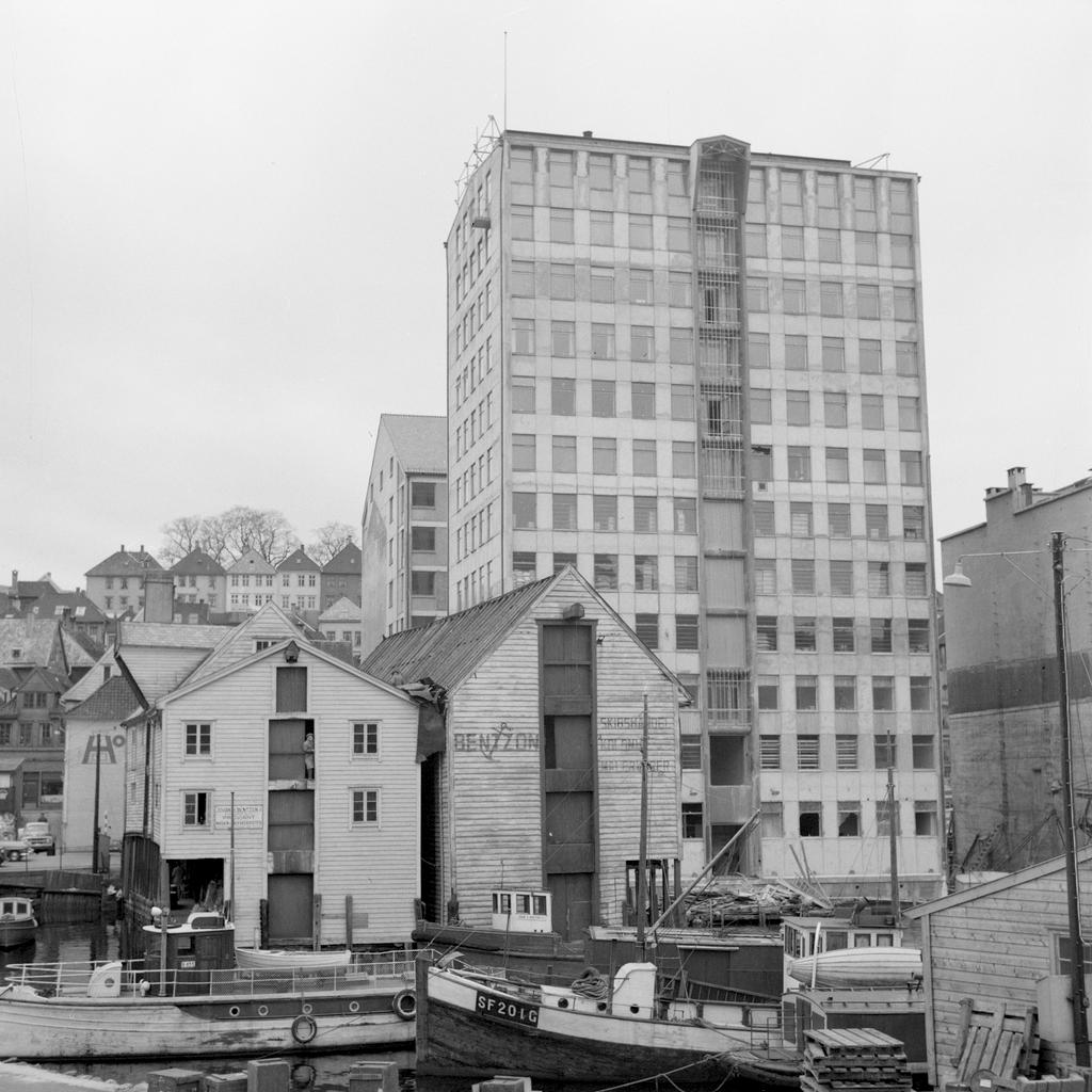 Dette bildet er knyttet til emnene Bygninger, Fiskebåt, Lagerhus, Næringsbygg, Pakkhus, Sjøbod