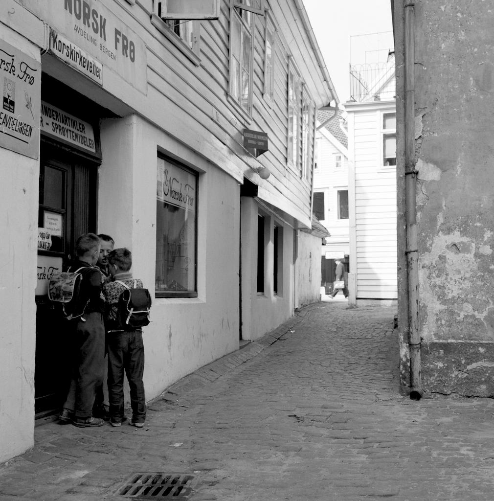 Dette bildet er knyttet til emnene Advertising sign, Brostein, Butikk, Gatelys, Gutt, Ransel, Skoleelev, Smau
