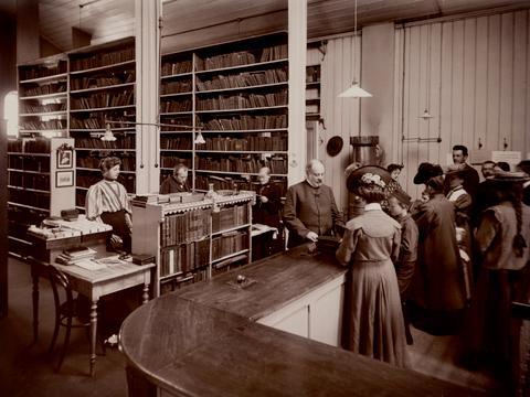 Bergen offentlige biblioteks lokaler i Kjøttbasarens loftsetasje fra 1879 til 1917. Fra venstre Laura Pedersen, Wollert Danchertsen og Valborg Elise Platou. Stående ved skranken Ivar Sivertsen, og sittende ved ovnen Agnes Sivertsen. I artikkelen i Morgenavisen er Ivar Sivertsen omtalt som Sven Sivertsen. Det kan være en en missforstålese av at han var bokbindersvenn før han begynte på biblioteket. Morgenavisen.
