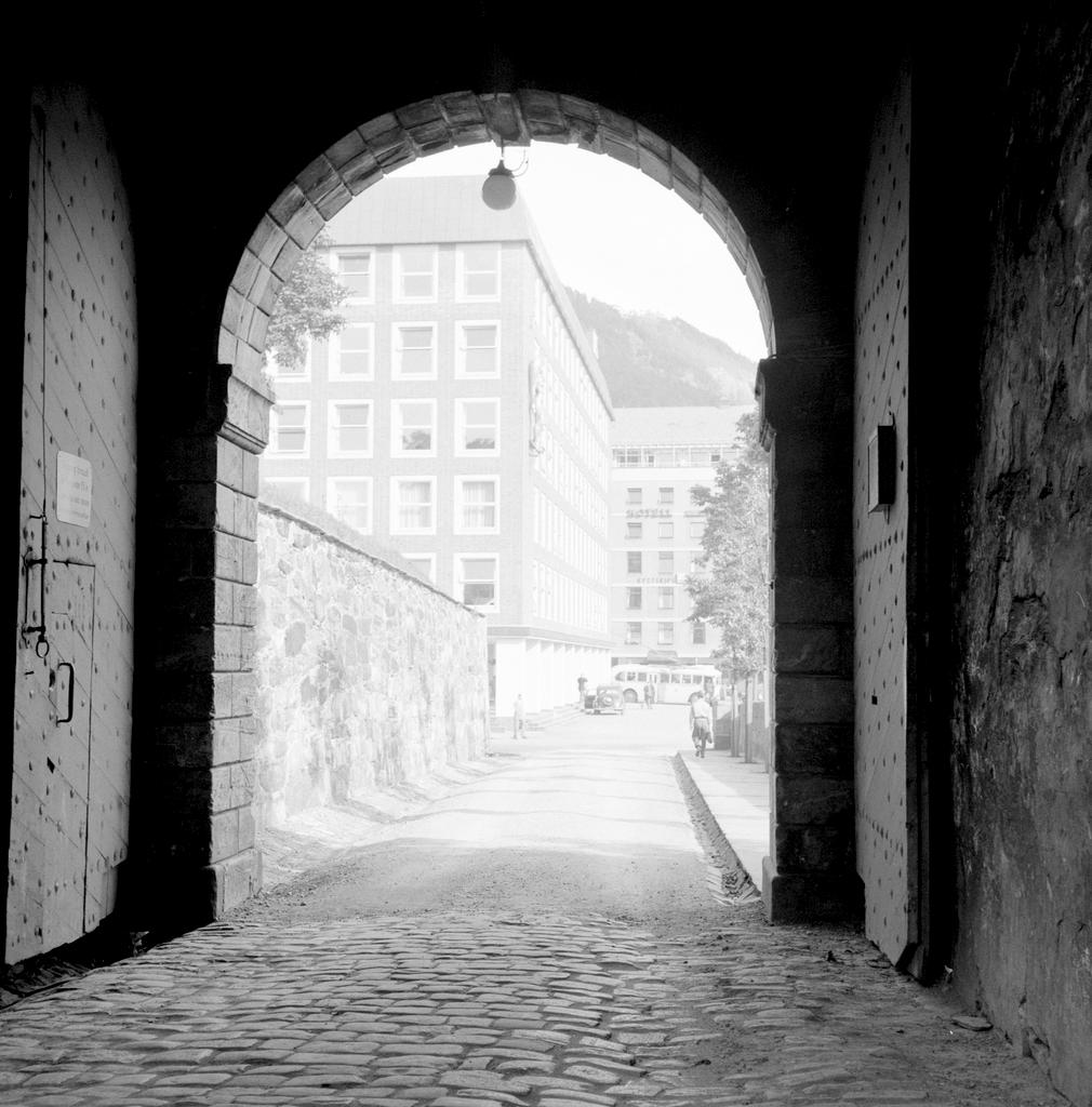 Portalinngang til Bergenhus fotografert mot Bergenske dampskipsselskap sitt bygg, Bradbenken 1.