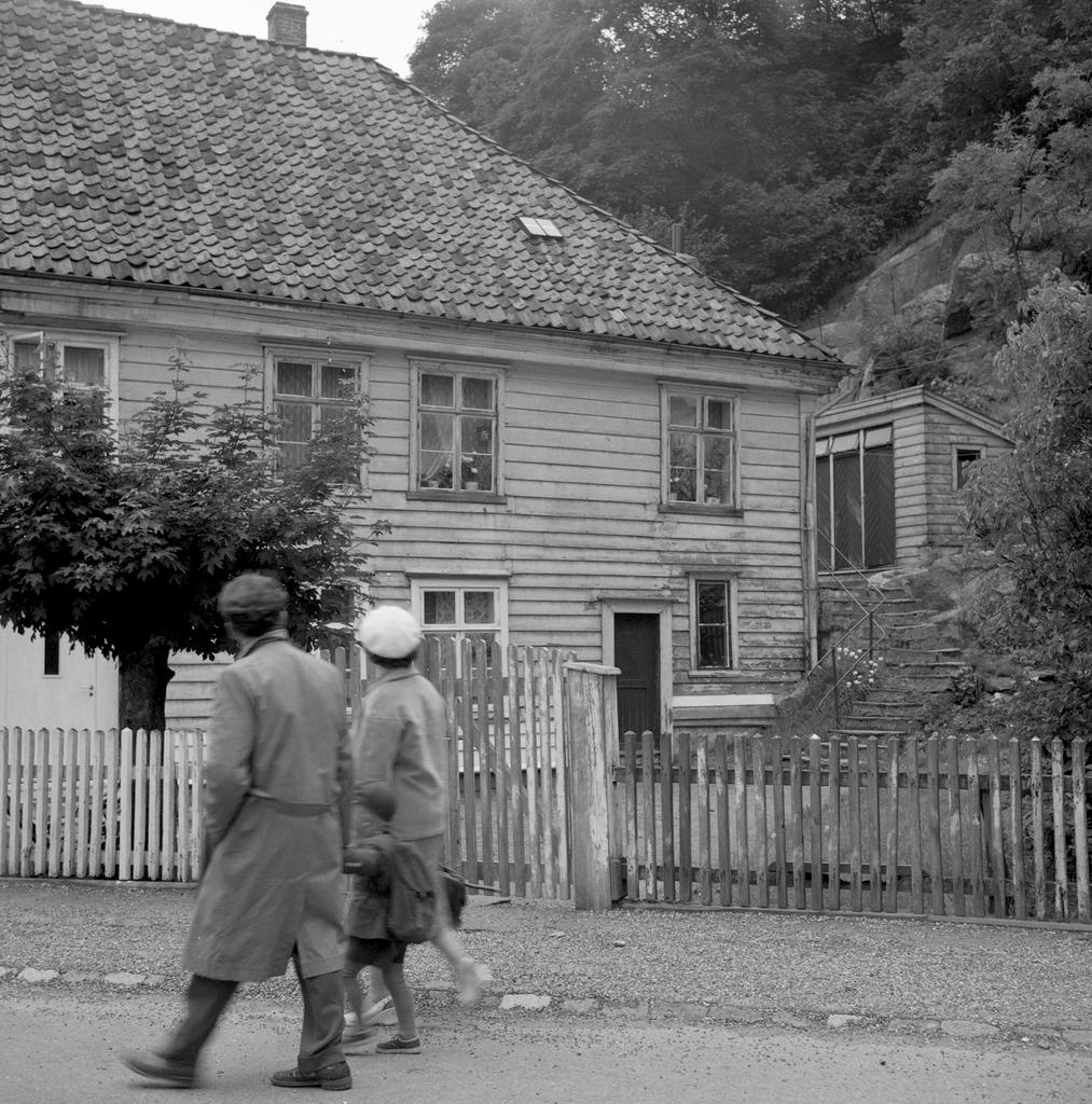 Dette bildet er knyttet til emnene Barn, Bolighus, Kvinne, Mann, Port, Stakittgjerde, Trehusbebyggelse by