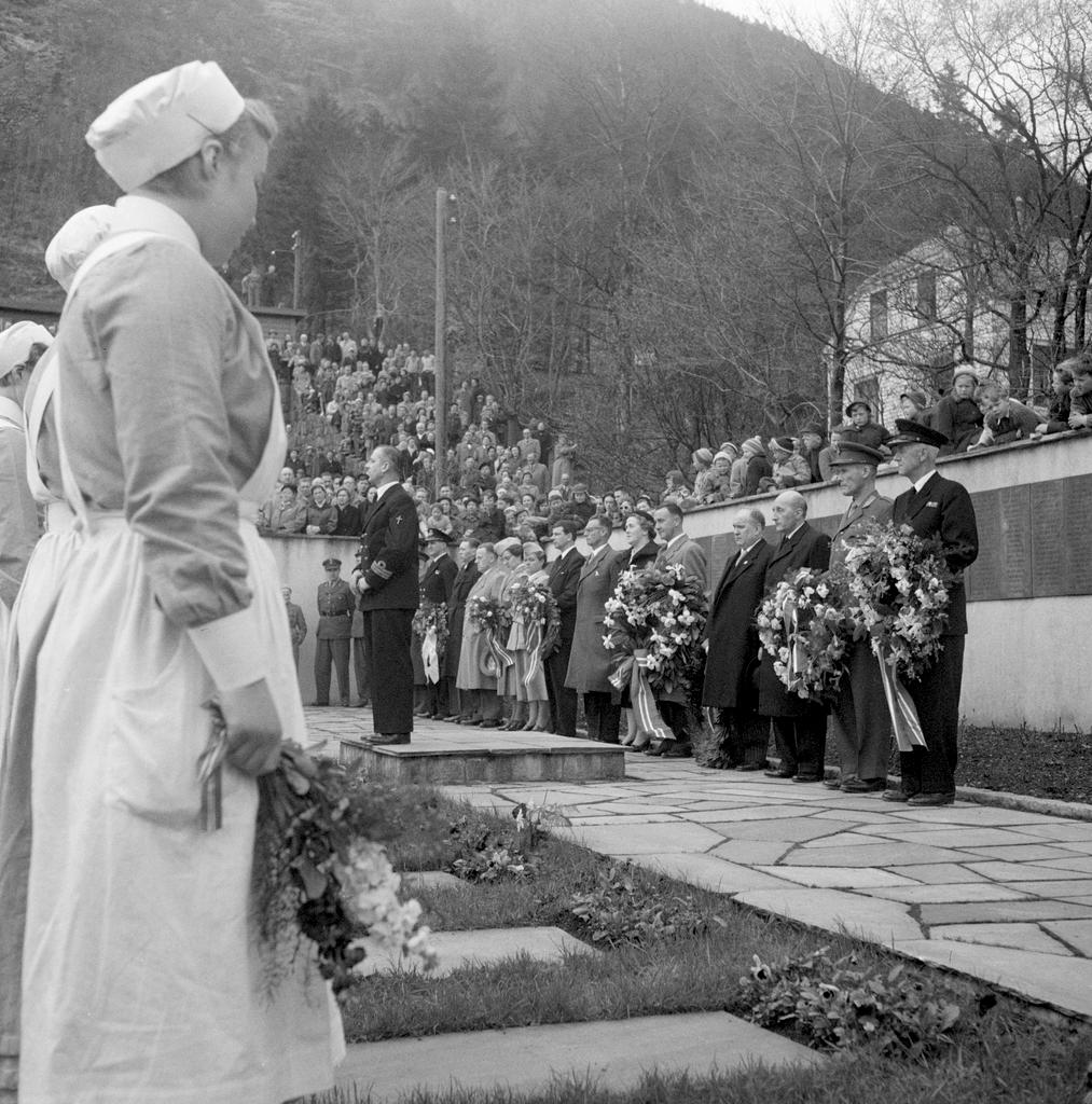 Dette bildet er knyttet til emnene Blomster, Blomsterkrans, Folkemengde, Gravplass, Krigsgrav, Sykepleier