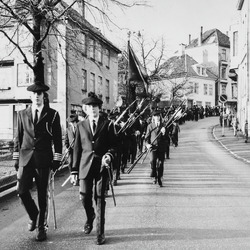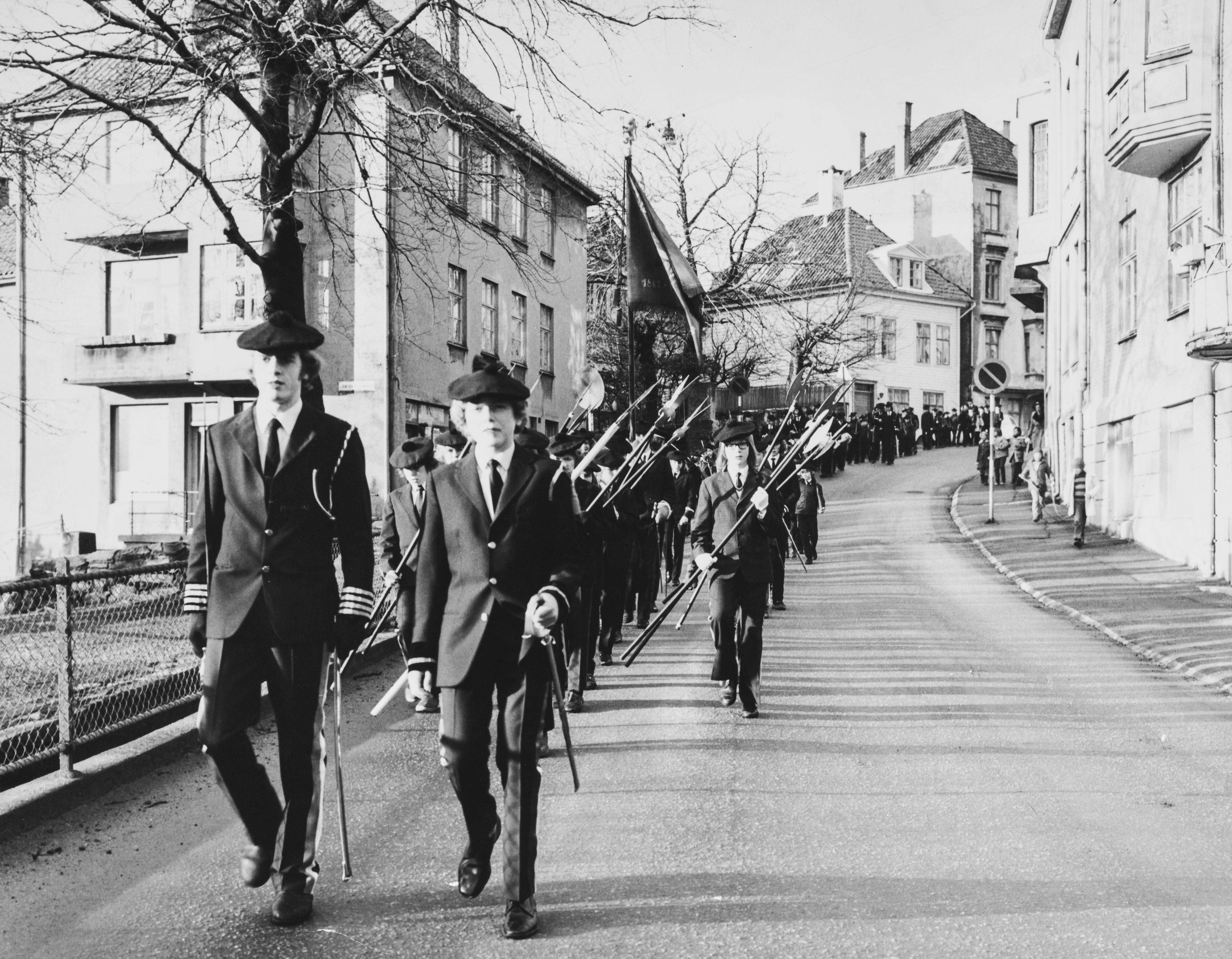 Dette bildet er knyttet til emnene Buekorps, Buekorpsgutter, Buekorpsuniform, Fane, Hellebard, Marsjere, Offiser