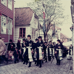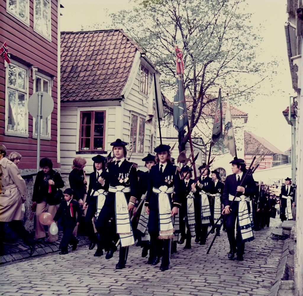 Dette bildet er knyttet til emnene 17. mai, Brostein, Buekorps, Buekorpsgutter, Buekorpsuniform, Fane, Hellebard, Offiser, Trehusbebyggelse by
