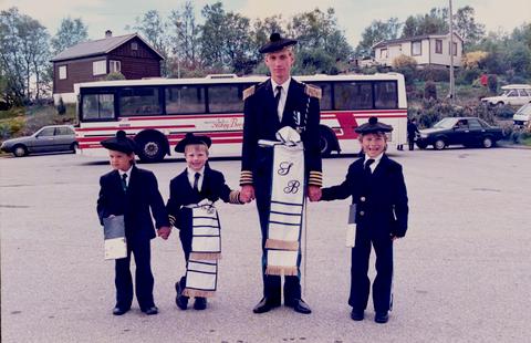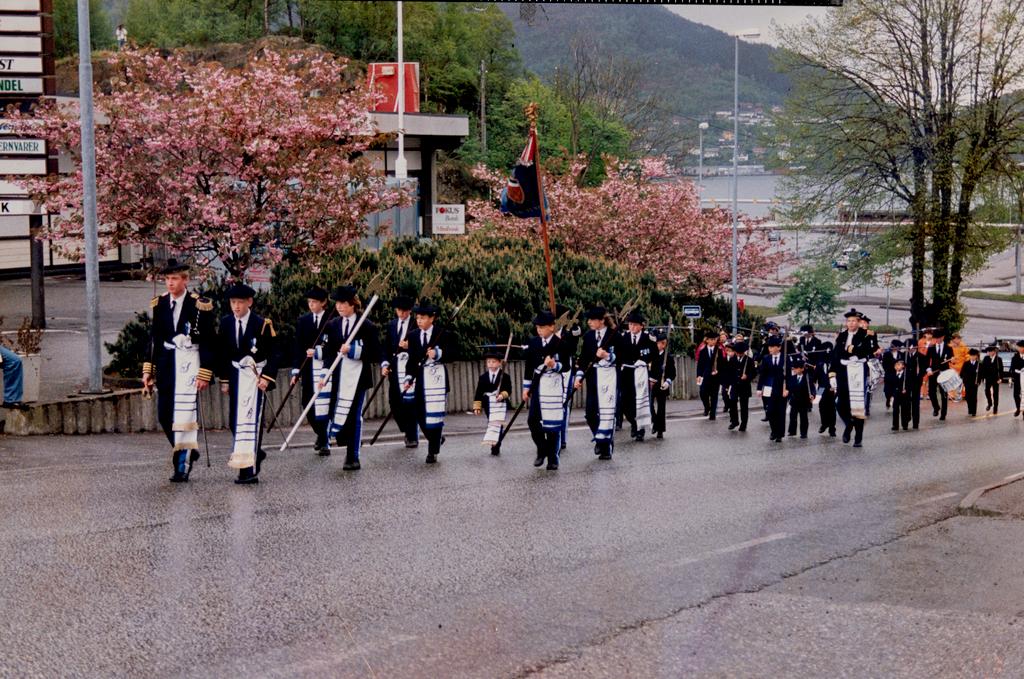 Sydnæs Bataljonen marsjerer opp fra Kleppestø kai, Askøy på vei til åpning av NM i friidrett (2.-4.. aug) på Ravnanger Friidrettsbane hvor korpset hadde oppdrag som åpningsnummer. Her på vei opp fra ferjen til bussene, og videre til Ravnanger.