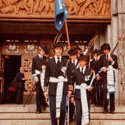 Dette bildet er knyttet til emnene Buekorps, Buekorpsgutter, Buekorpssjal, Buekorpsuniform, Epålett, Fane, Hellebard, Offiser, Sjef, Skottehuer