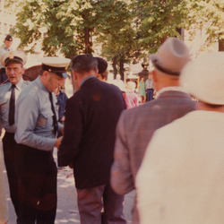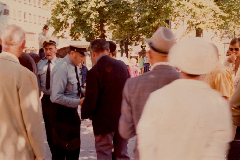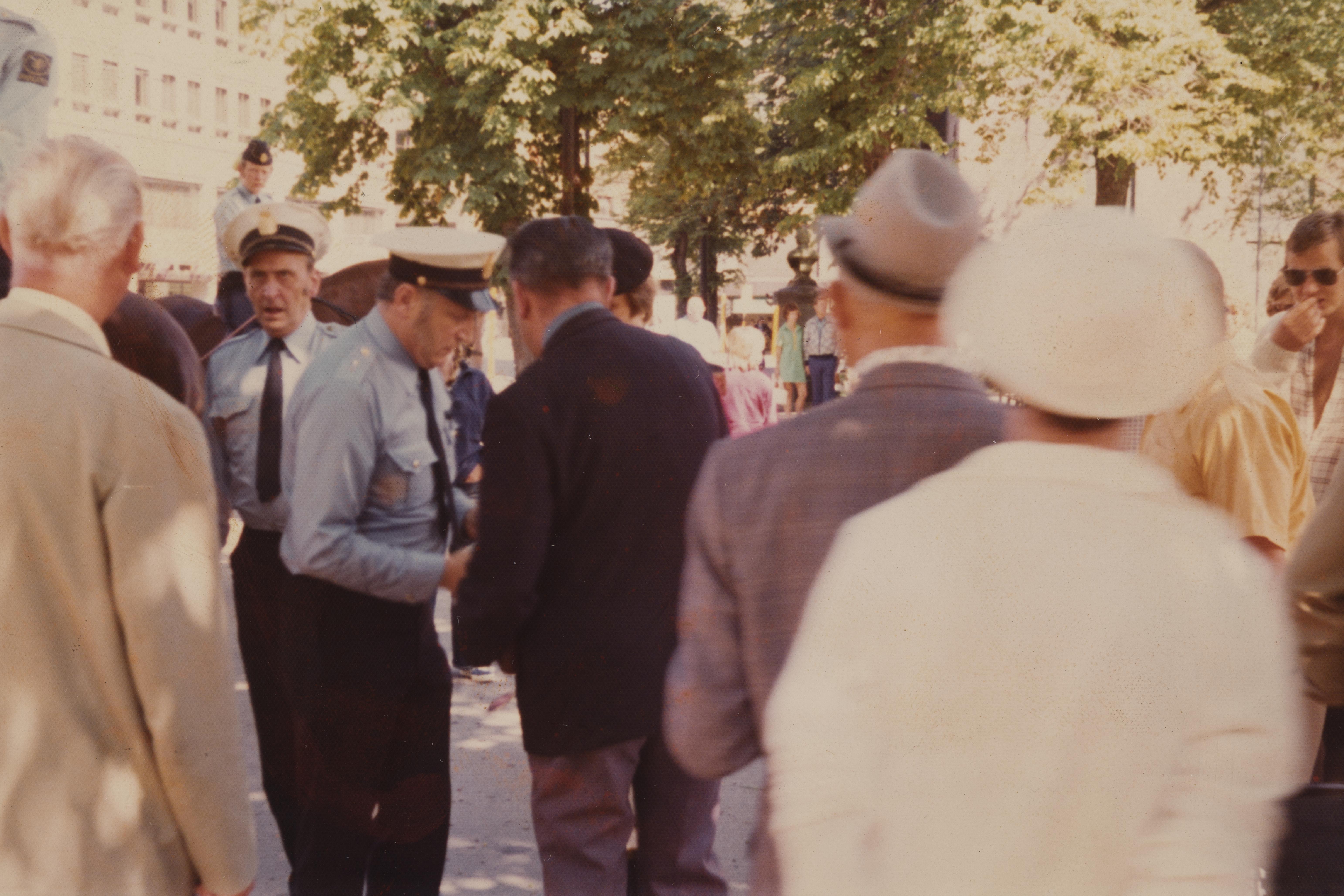 Trolig politiets gjennomgang (sammen med Nils Iversen?) av marsjen fra Stortorvet, via Karl Johans gate og opp til Slottsplassen 24. juni 1975.