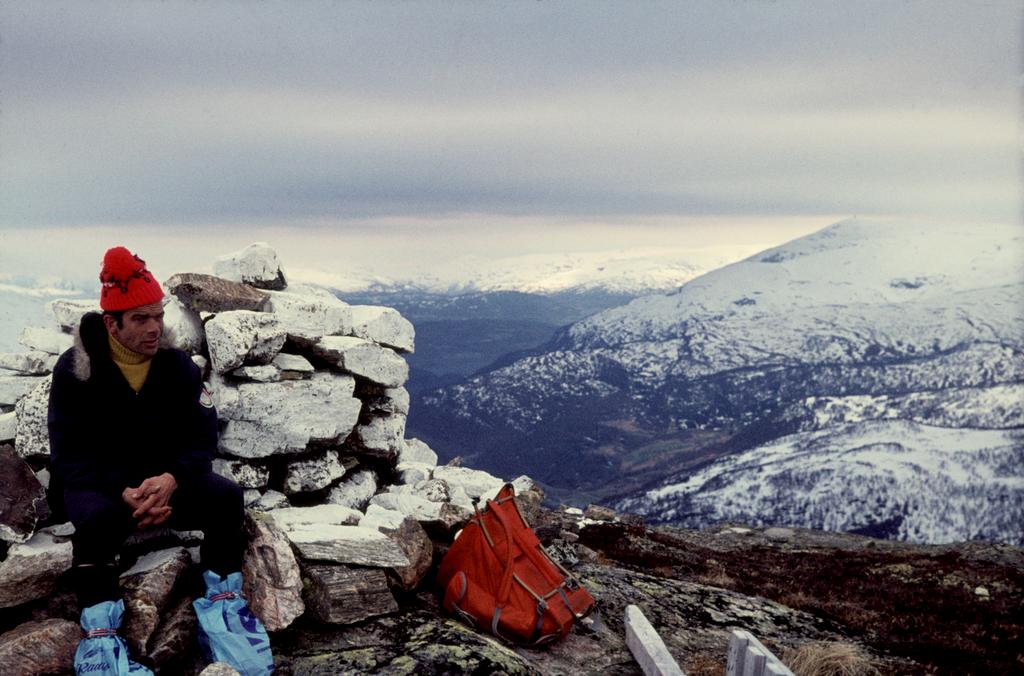 Dette bildet er knyttet til emnene 17. mai, 35 mm, Fargefotografi, Fjell, Fjelltur, Herresko, Lysbilde, Oversiktsbilde, Ryggsekk, Skilue, Snø, Varde