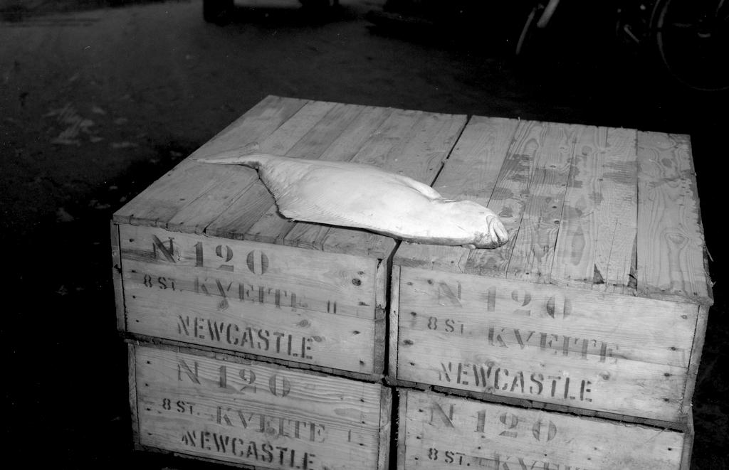 Dette bildet er knyttet til emnene Fiskeeksport, Fiskeindustri, Kjølelager, Kveite, Trekasse