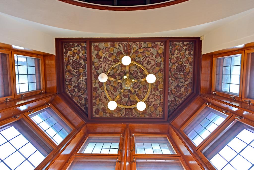 Dette bildet er knyttet til emnene Blyglassvindu, Bygninger, Interiør, Karnapp, Taklampe, Universitet og forskning