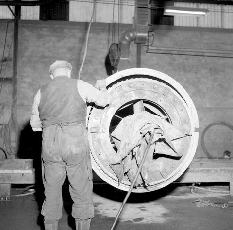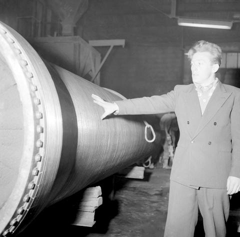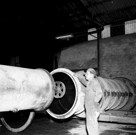 Dette bildet er knyttet til emnene Arbeider, Fabrikk, Interiør, Mann, Maskin, Mellomformat, Pressefotografi, Publiserte bilder, Rør