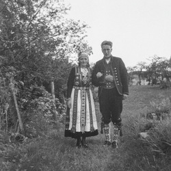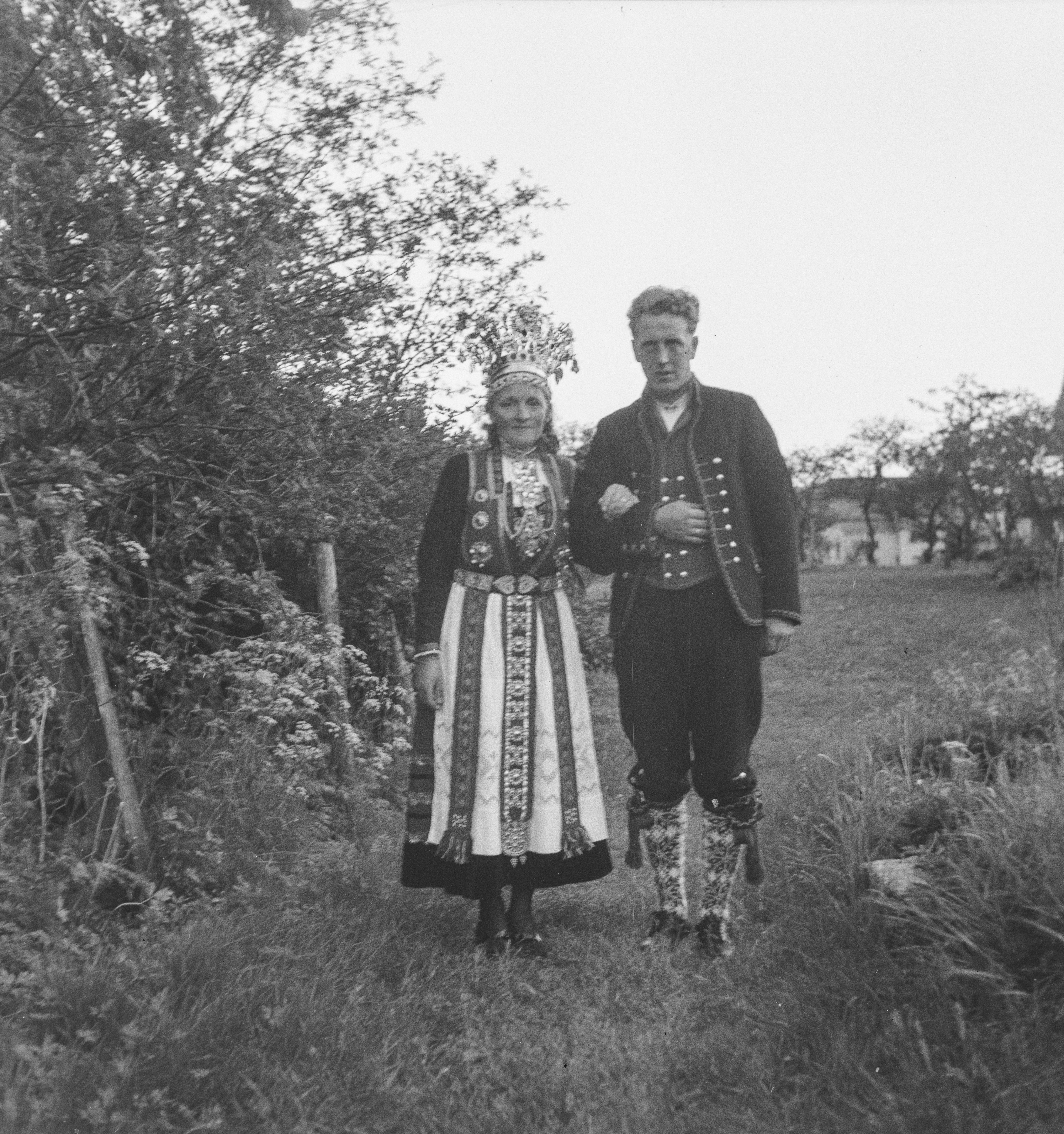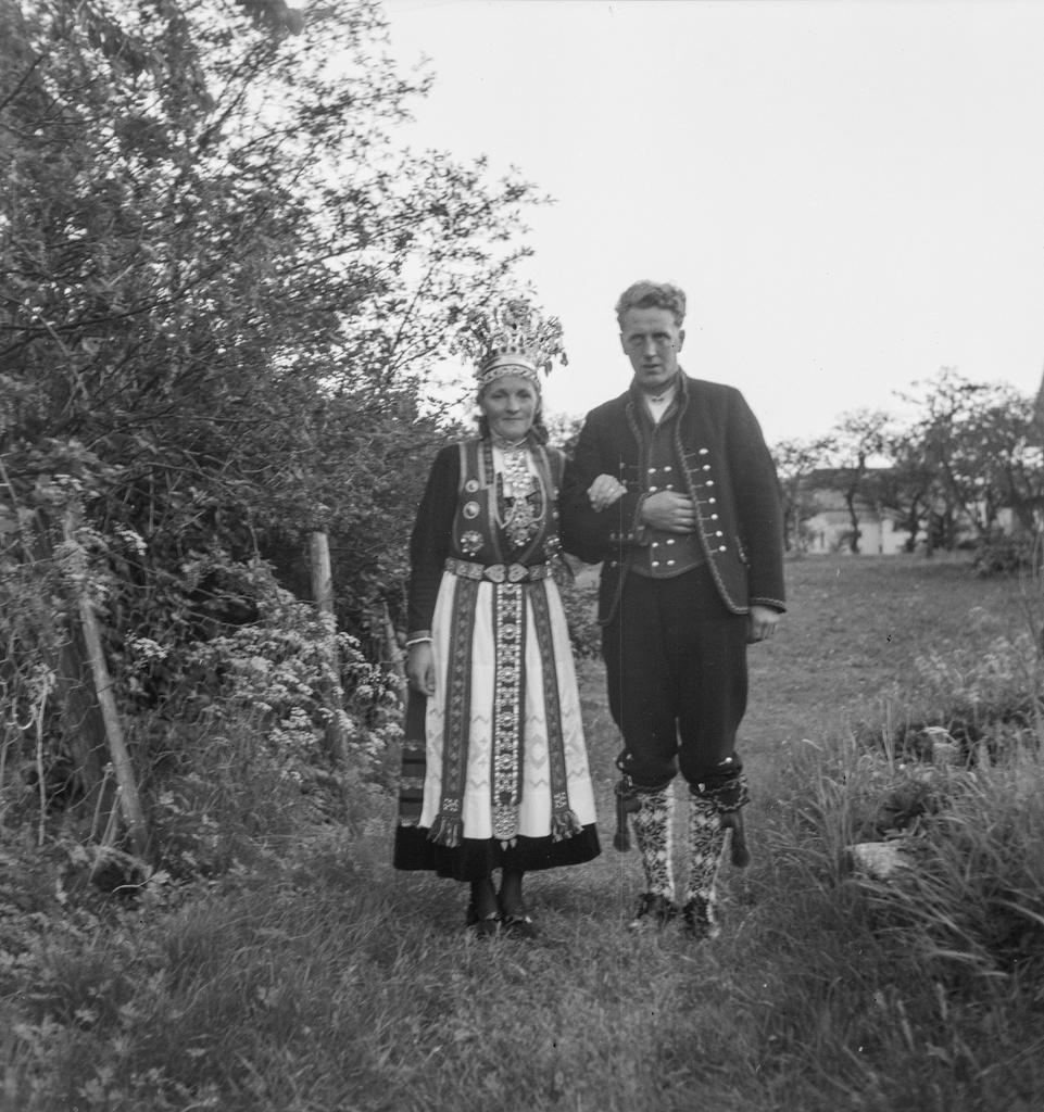 Dette bildet er knyttet til emnene Brudekrone, Brudepar, Bunad