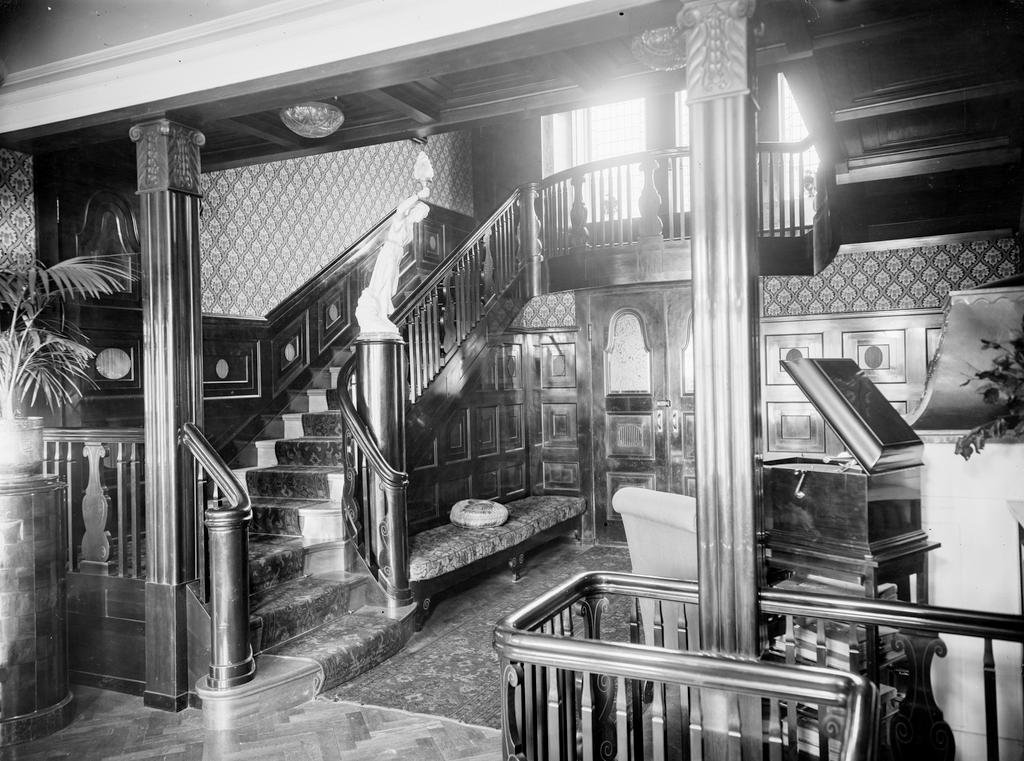 Dette bildet er knyttet til emnene Arkitekt, Arkitekter, Gelender, Hall, Panel, Sofabenk, Statue/Skulptur, Søyler, Tapet, Trapp, Villa
