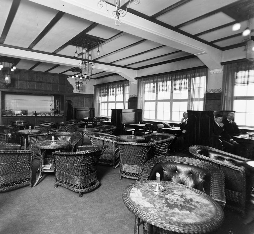 Dette bildet er knyttet til emnene Arkitekt, Arkitekter, Hotell, gjestgiveri, skysstasjon, Hoteller, Rottingbord, Rottingstol, Spise- og dansesal, Spisegjester