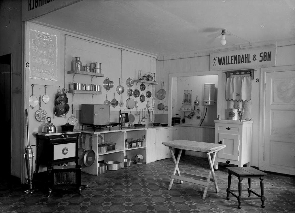 Dette bildet er knyttet til emnene Bord, Gryte, Jernvarehandel, Jernvarehandlere, Kjøkkenutstyr, Komfyr, Skap, Støvsuger
