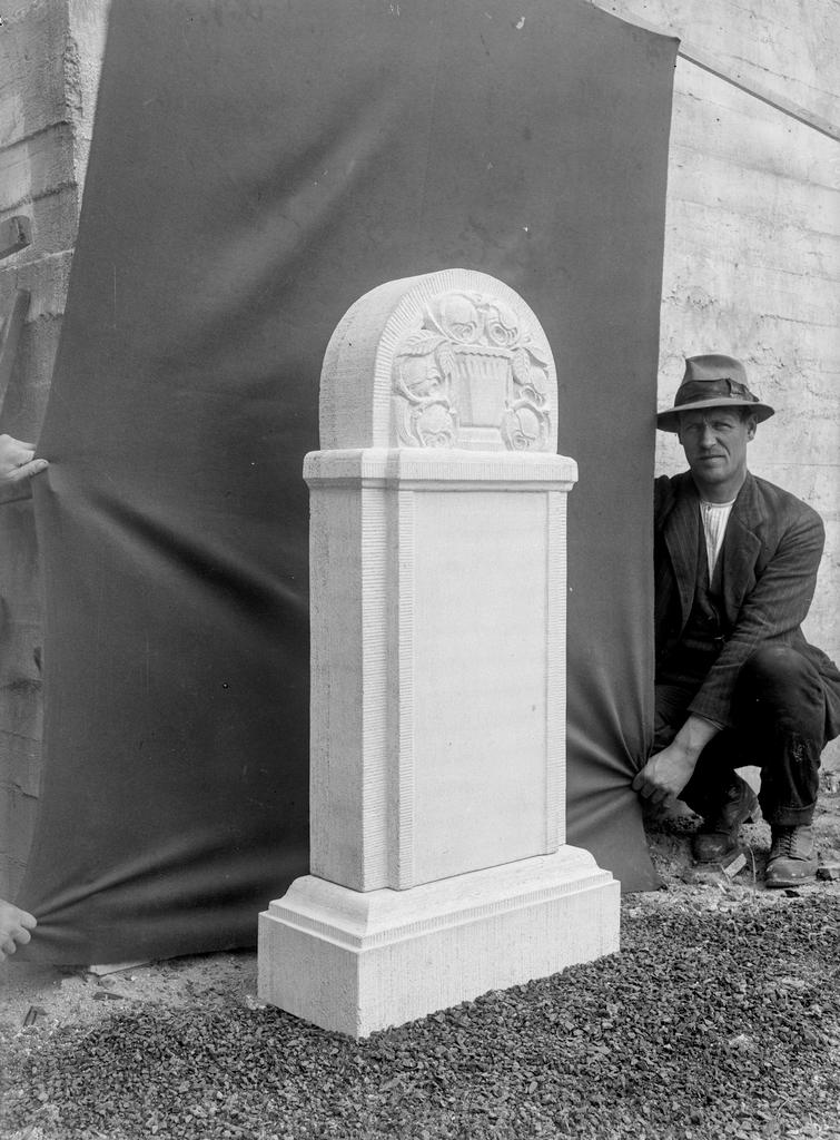 Dette bildet er knyttet til emnene Bygningsartikler & cementstøperier, Gravstein, Herrehatt, Mann, Sementstøperi