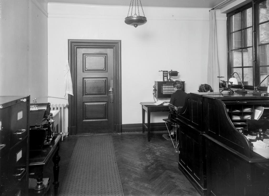 Dette bildet er knyttet til emnene Dampskibsekspeditioner, Dør, Kontor, Kvinne, Sentralbord, Skrivebord, Spedisjonsforretning, Speditionsforretninger