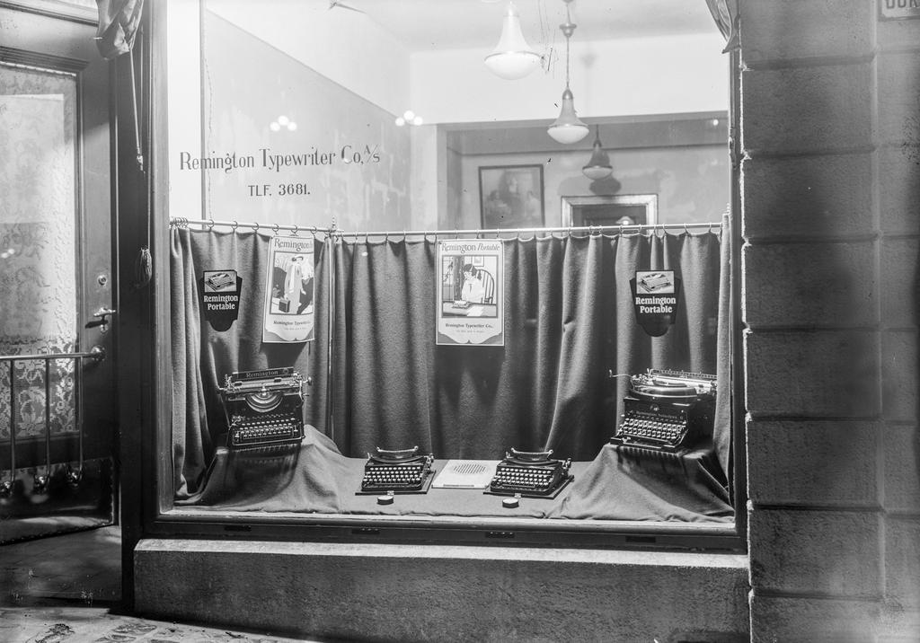 Remington Typewriter Co. A/S, Ole Bulls plass 6. Vindusutstilling. Fire skrivemaskiner utstilt. To av de portable. Ca 1927