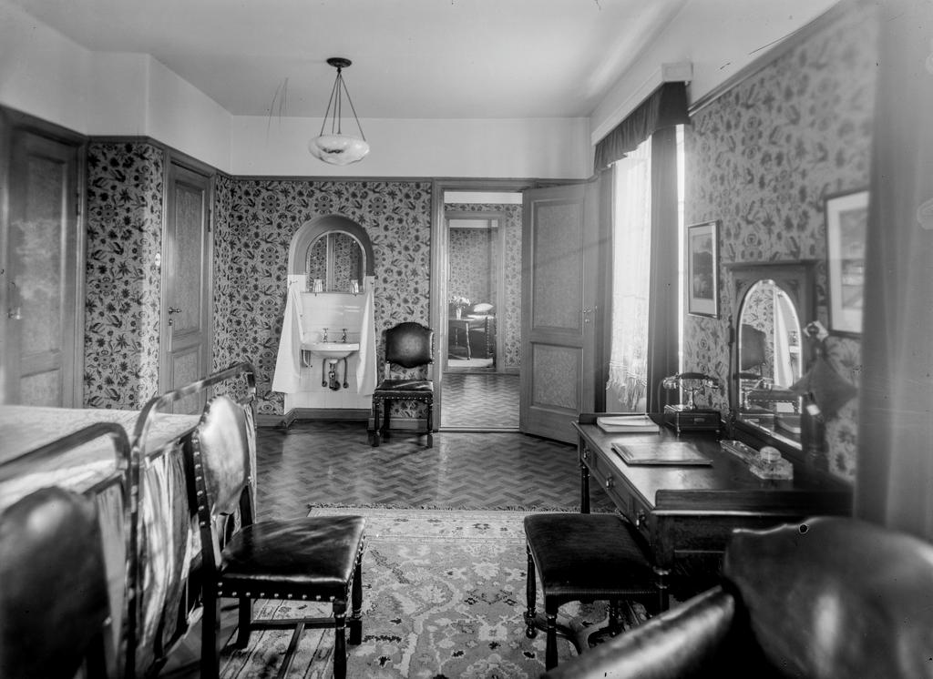 Dette bildet er knyttet til emnene Arkitekt, Arkitekter, Hotell, gjestgiveri, skysstasjon, Hoteller, Hotellrom, Stol, Tapet, Telefon, Vask