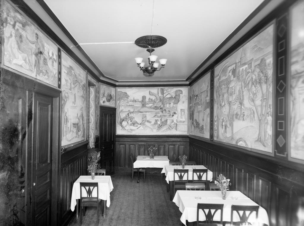 Dette bildet er knyttet til emnene Bord, Caféer & restaurationer, Restaurant/Kafe, Stol, Veggmaleri