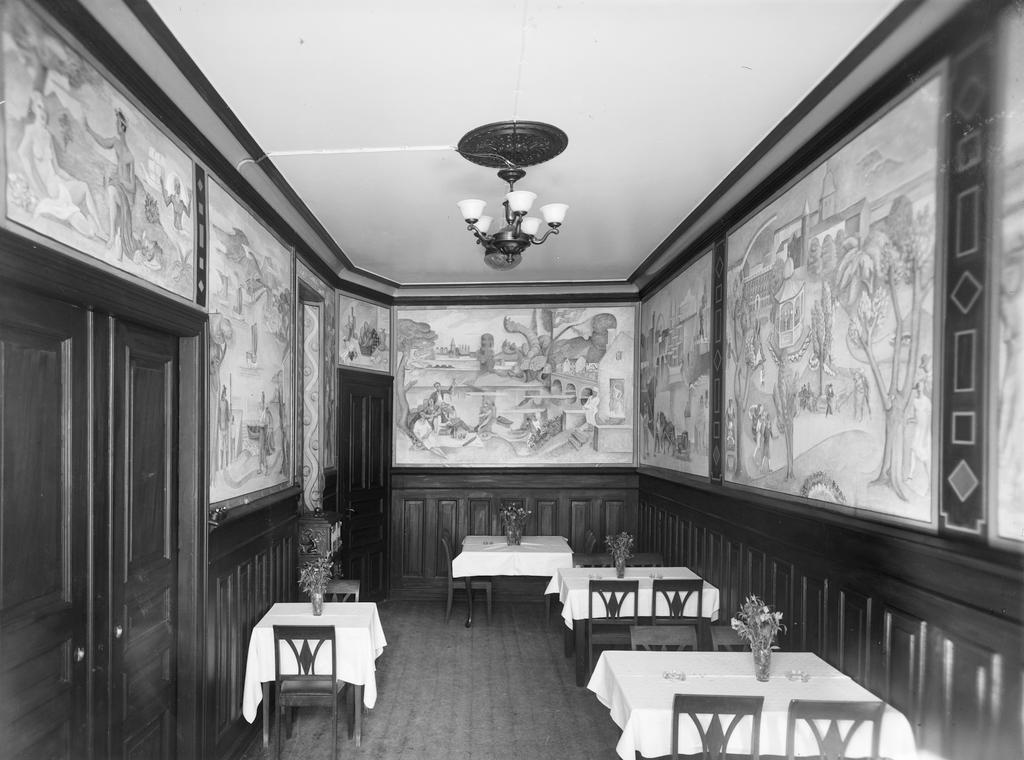 Dette bildet er knyttet til emnene Bord, Caféer & restaurationer, Restaurant/Kafe, Stol, Veggmaleri