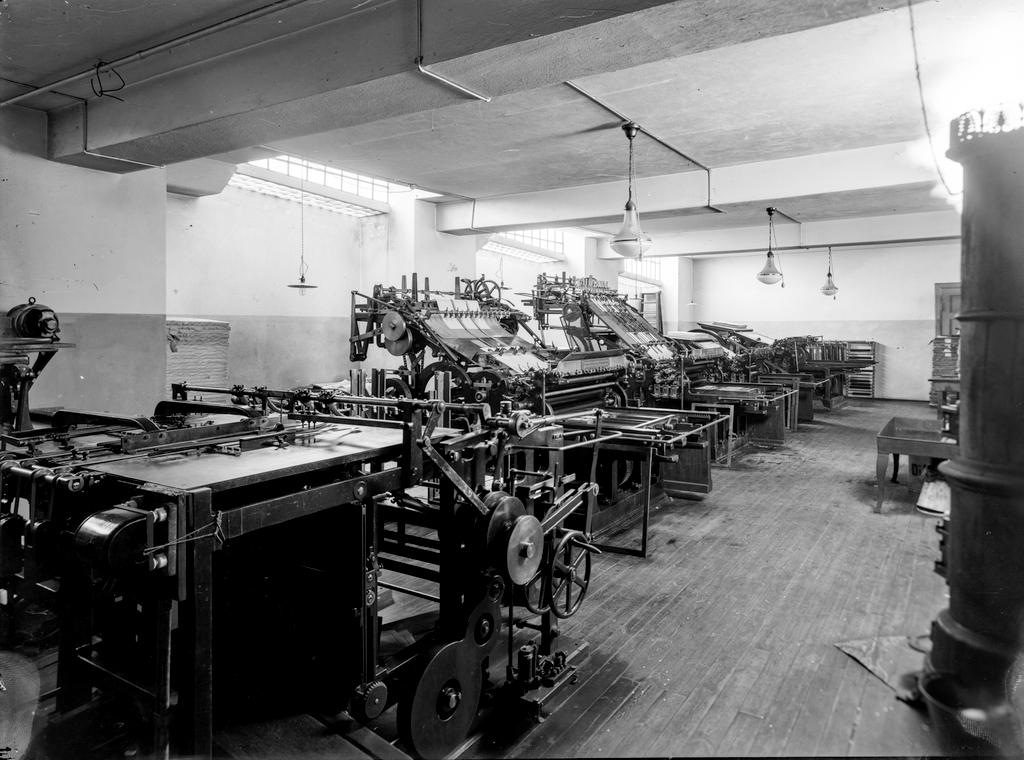 Dette bildet er knyttet til emnene Interiør, Maskin, Ovn, Taklampe, Trykkeri