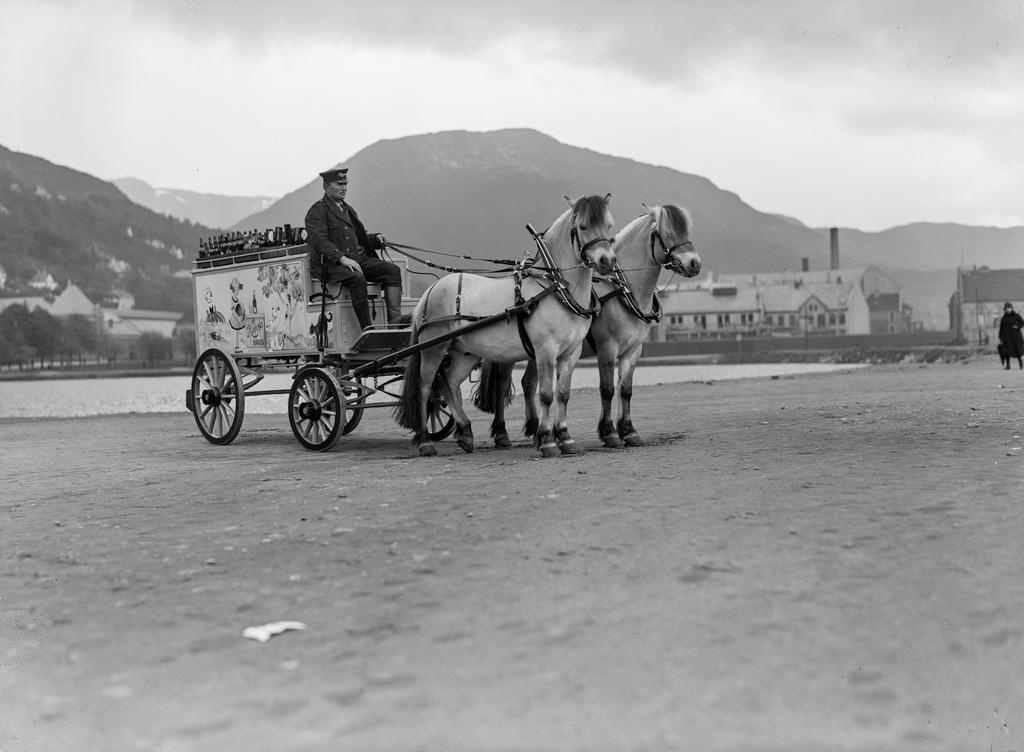 Dette bildet er knyttet til emnene Allmenning, Bryggeri, Bryggerivogn, Fjordhest, Hest, Mann, Skysskar, vognmann, kusk, Tospann, Ølbryggerier & agenter