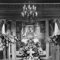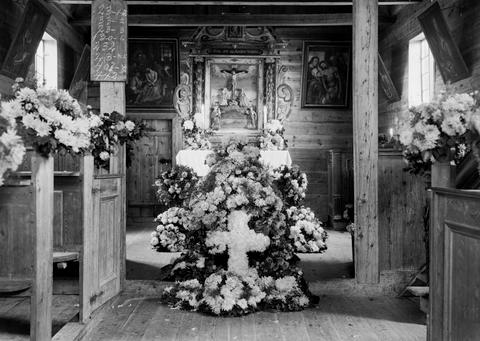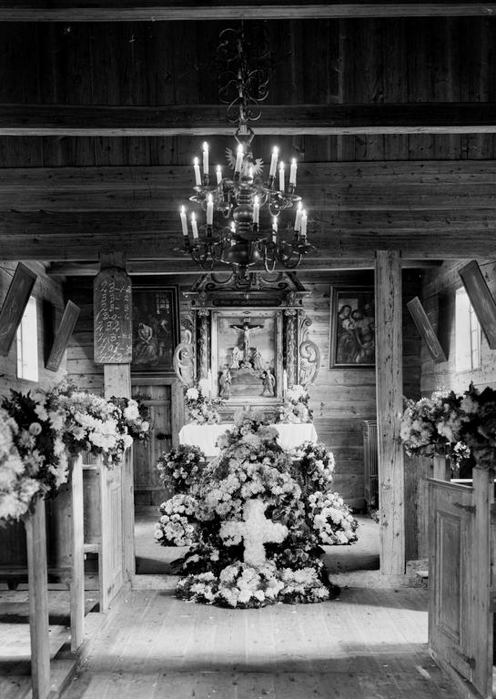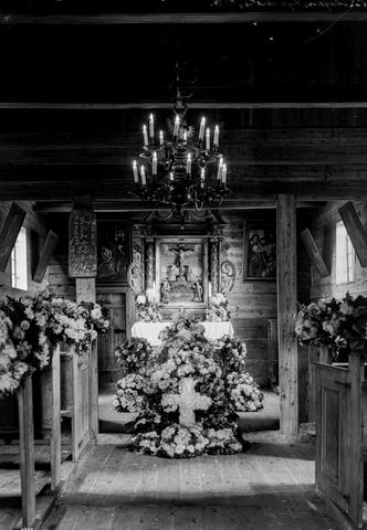 Dette bildet er knyttet til emnene Altertavle, Begravelse, Blomsterkrans, Kapell, Kirkeinteriør, Lysekrone, Oppdragsfoto