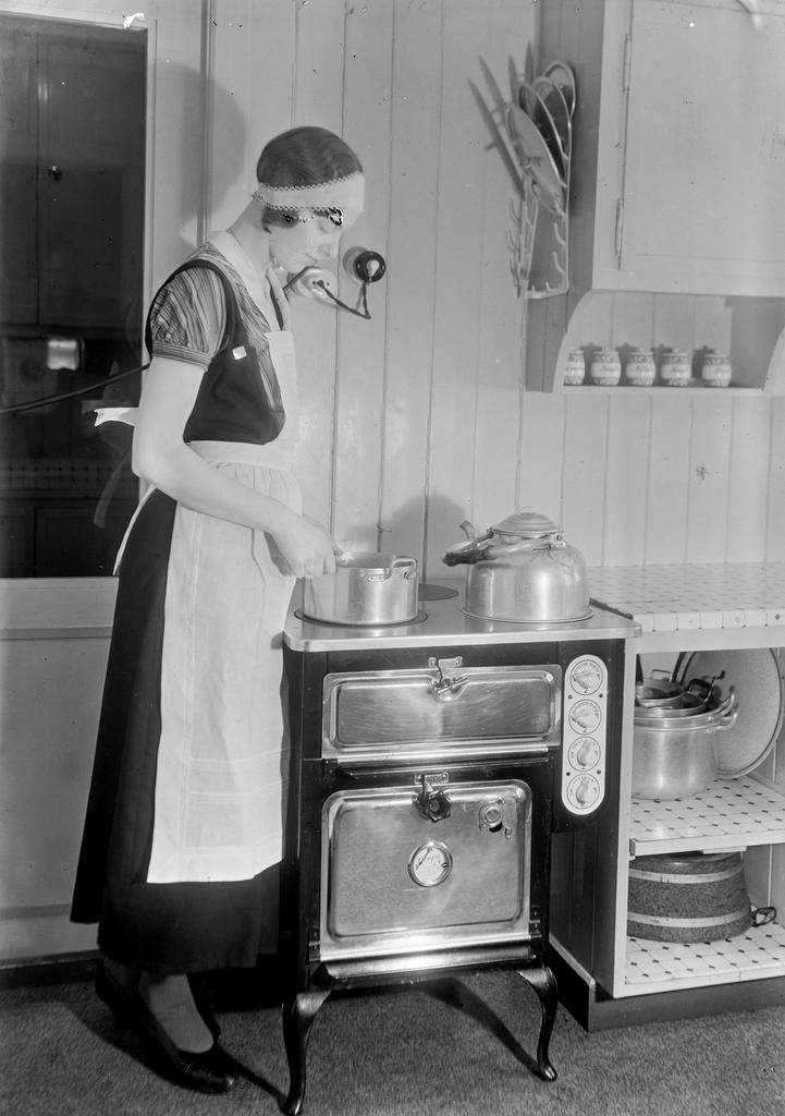 Dette bildet er knyttet til emnene Forkle, Kaffekanne, Kjøkken, Komfyr, Kvinne, Kvinner i arbeid, Reklame, Reklamebureauer