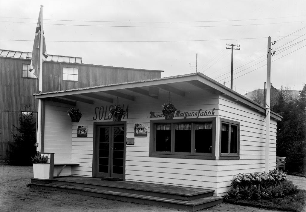 Utstillingsbygget Solstua til Mowinckel margarinfabrik. Standen ble utloddet gratis til "besøkende husmødre" som et lite sommerhus. Kilde: Bergens tidende 20.10.1933
