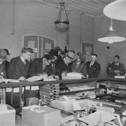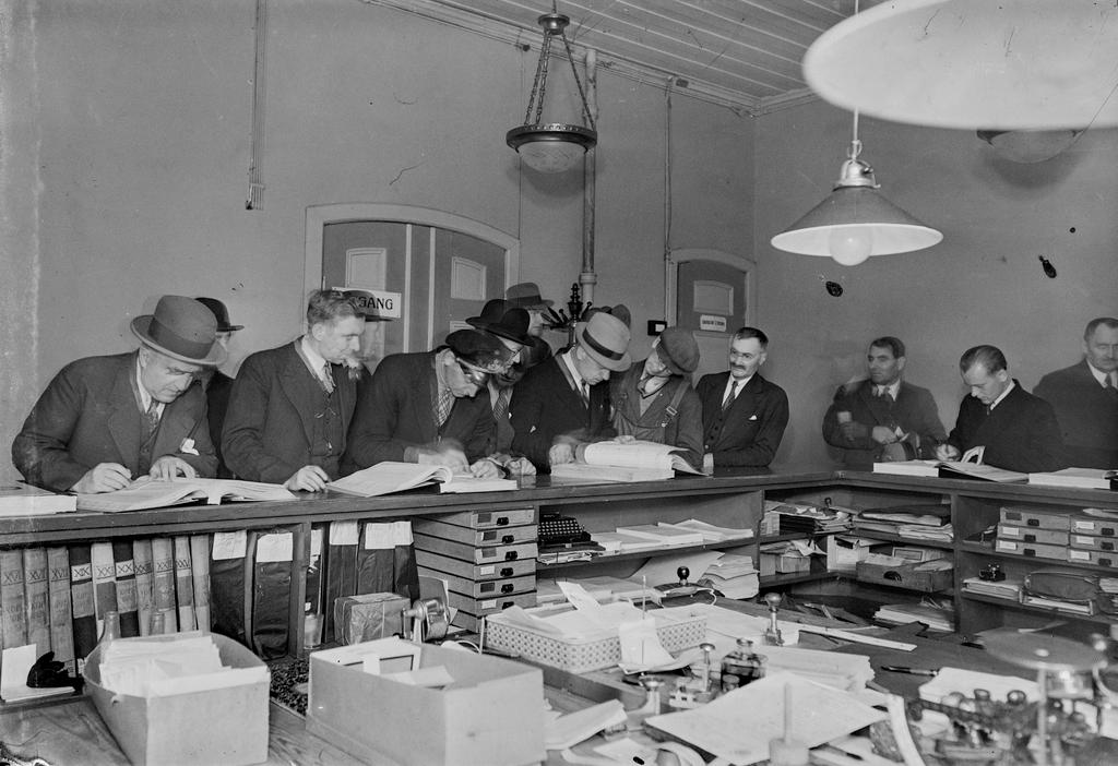 Dette bildet er knyttet til emnene Mann, Skatteligning, Skranke, Taklampe