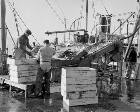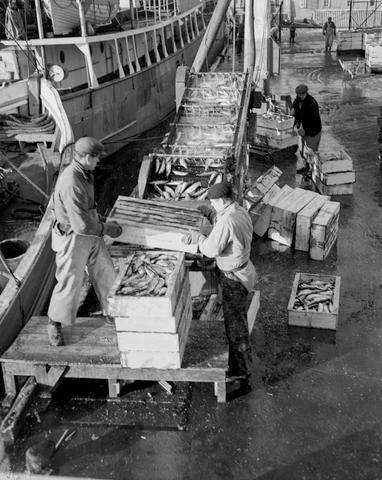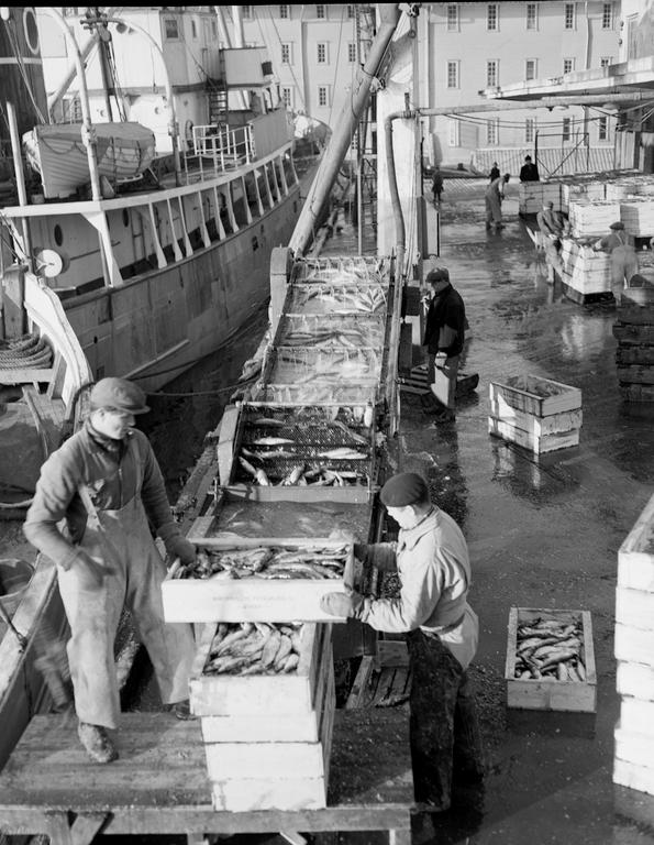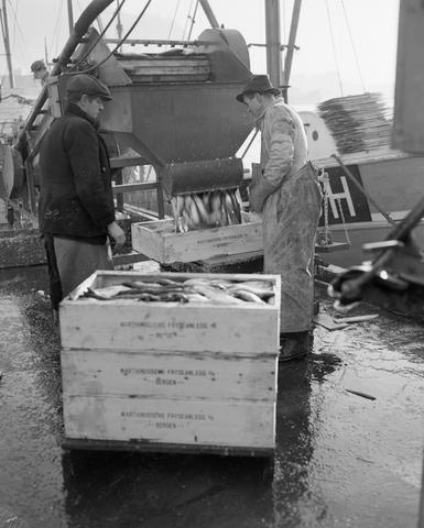 Dette bildet er knyttet til emnene Arbeider, Fisk, Fiskeindustri, Kaianlegg, Mann, Maskin, Oppdragsfoto, Sild