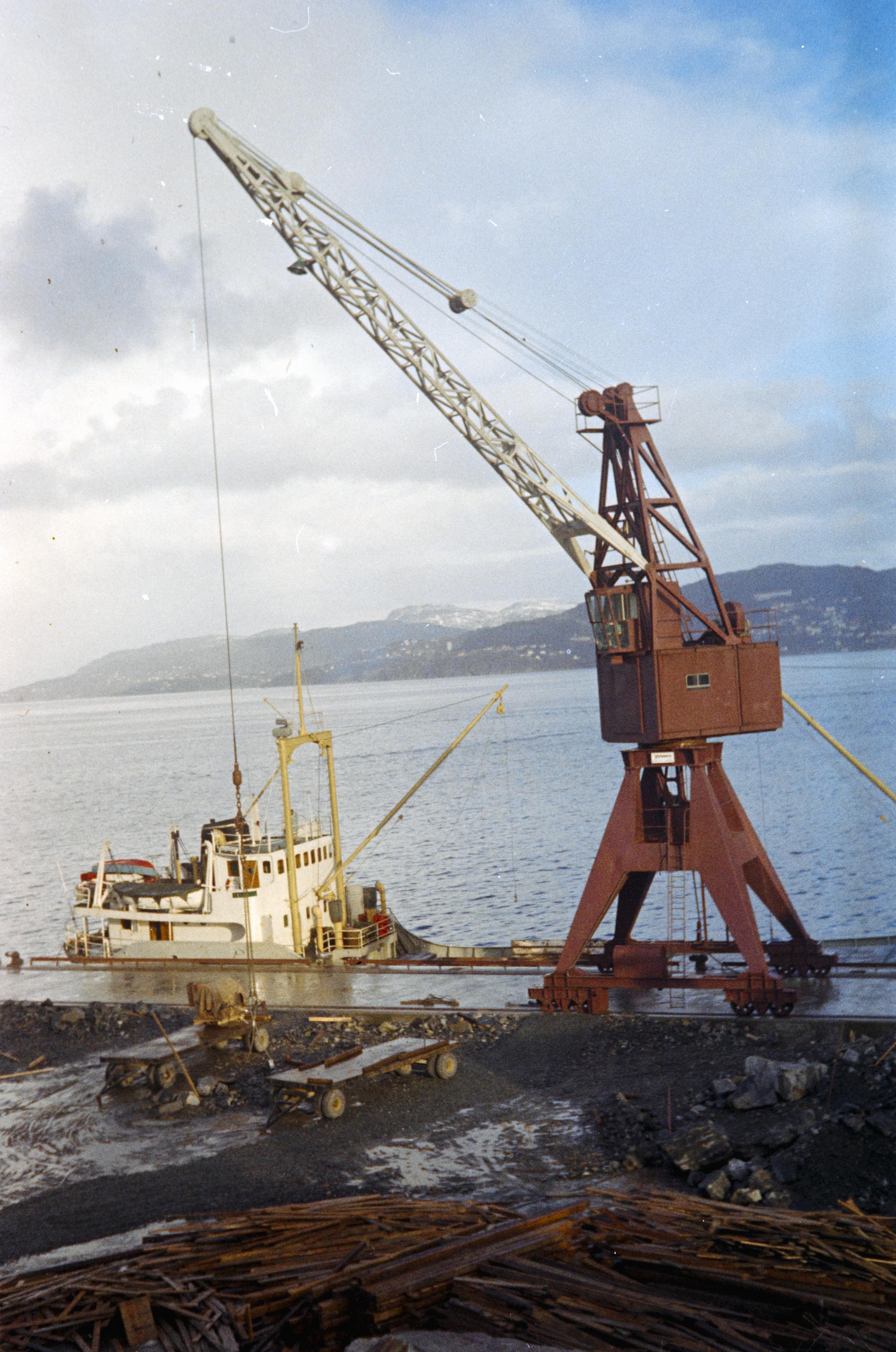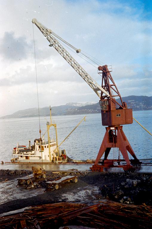 Dette bildet er knyttet til emnene Heisekran, Jern- og metallvarefabrikk, Kaianlegg, Lasteskip, Valseverk
