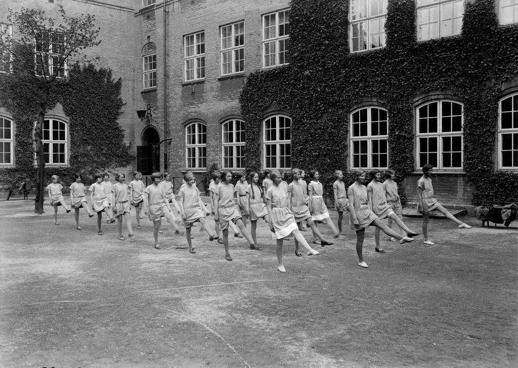 Dette bildet er knyttet til emnene Elev, Gymnastikk, Skolebygning, Skolejente, Skoleplass