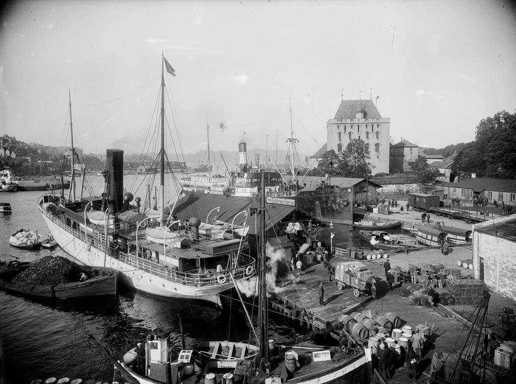 Dette bildet er knyttet til emnene Arbeider, Dampskip, Festning, Fiskebåt, Havn, Havneskur, Hest, Hestekjerre, Jernbanevogn, Kran, Kull, Robåt, Tønne